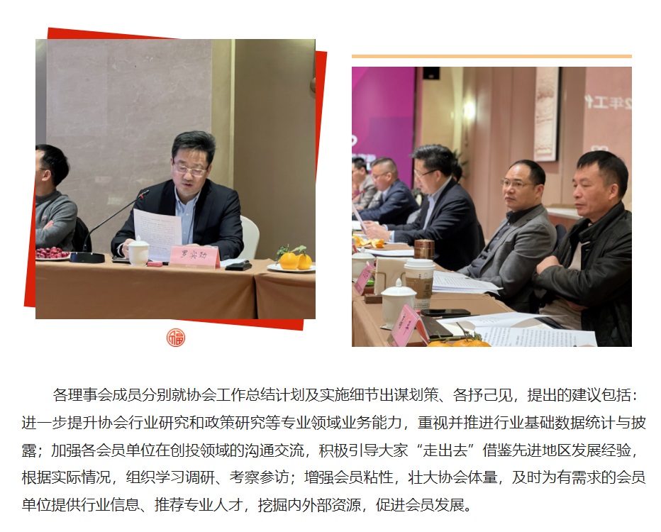 会议由秘书长虞亮主持,听取并审议了《2021年工作报告和2022年工作计划》及财务情况说明。 会长罗实劲就立足本职工作、畅通交流渠道、打造服务品牌、提升活动成效、加强对外合作等五个方面对2021年度工作进行了回顾。过去的一年里,协会以习近平新时代中国特色社会主义思想为指导,学习贯彻党的十九届六中全会精神,深度融入江苏和常州经济发展脉动,在市发改委及相关政府部门的指导下,在会员单位、合作伙伴的大力配合下,坚持“一面旗帜、两条主线、三方服务”的发展理念,发挥平台和桥梁作用,守正创新、担当作为,积极拓展服务方式和维度,各项工作保持良好发展势头。针对2022年的工作重心,罗会长提出了表彰创投榜样、创新服务形式、服务决策发展这三个方向,也引出了各理事单位对新的一年协会工作开展的想法和建议。